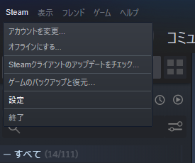 左上のSteam(文字)をクリックし、プルダウンメニューから「設定」を選択